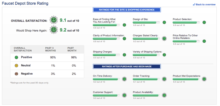On a scale of ten, Faucet Depot ranks 9.1 for the overall experience that customers